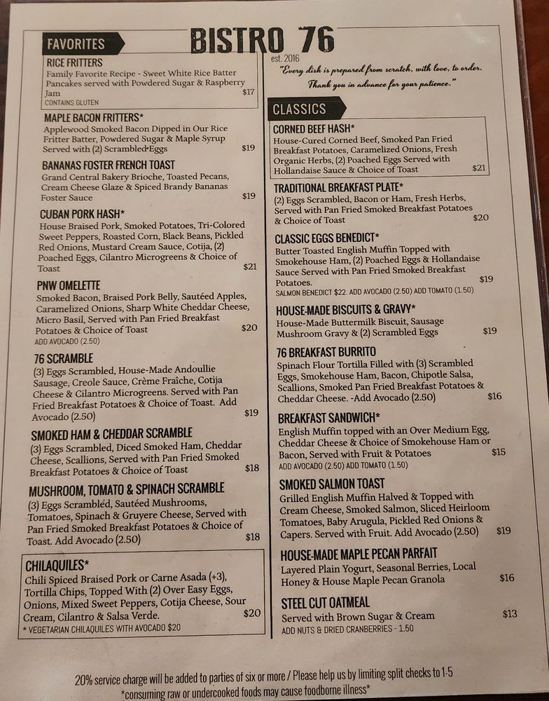 Welcome to Bistro 76 Cafe & Catering, a delightful haven for breakfast and brunch enthusiasts nestled in Edmonds, WA. This charming café effortlessly blends a classy yet casual atmosphere, making it perfect for family gatherings or a quiet morning retreat.